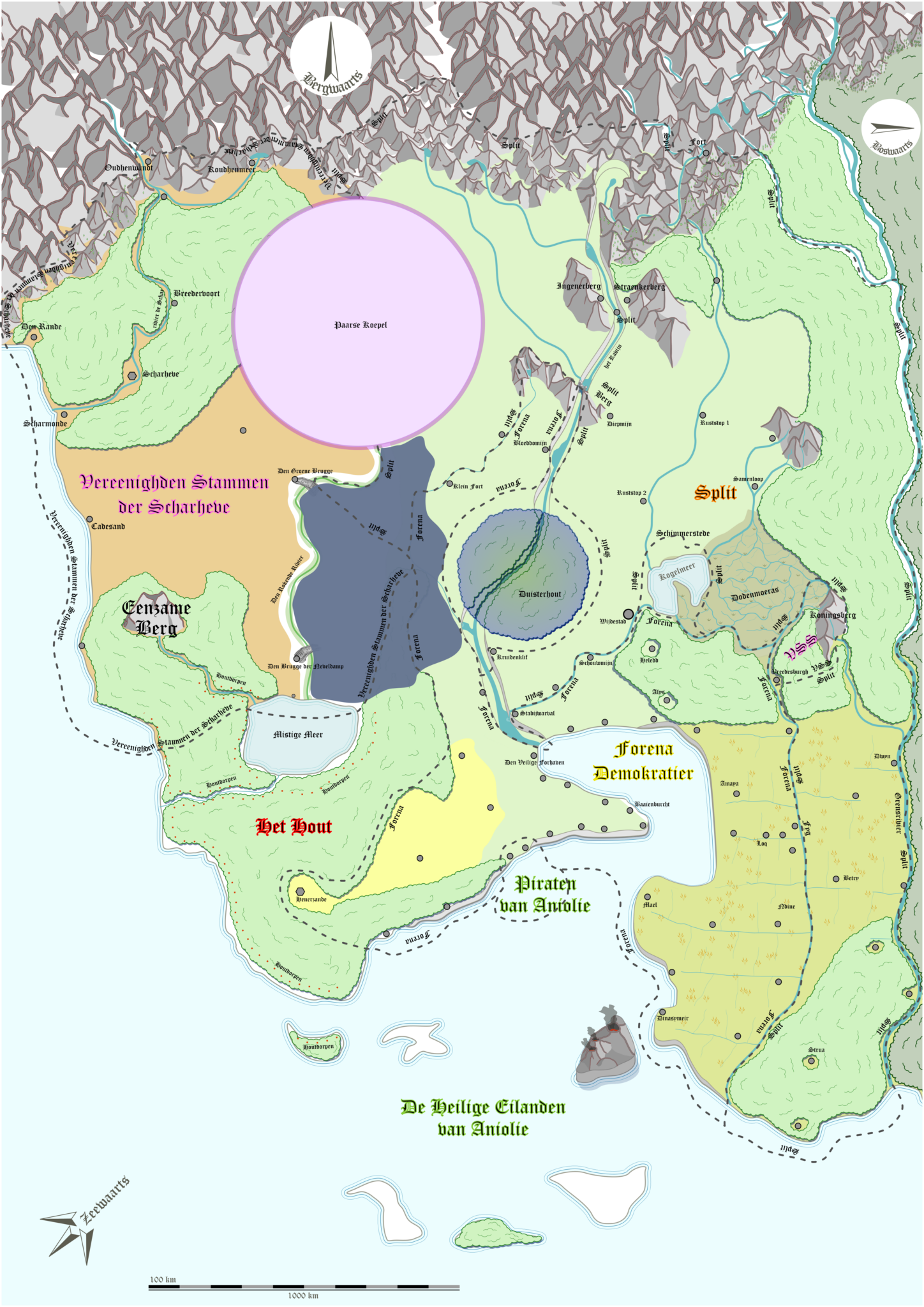 De grootste wonderlijkheid op deze kaart is de Paarse Koepel. Mocht je er naar toe lopen, dan zie je het heel lang niet. De illusie, of wat het ook is, is bijzonder. Je ziet de bergen op de achtergrond en eigenlijk helemaal niets van de Paarse Koepel. Tot je op een moment heel dichtbij blijkt te zijn en dan uit het niets verschijnt voor je een enorme ondoorzichtige paarse muur die ver de wolken in reikt. Duizend of honderd stappen, maar niet veel meer en dan sta je bij de koepel en zou je het kunnen aanraken. Echter, er zijn veel verhalen bekend waarom je dit niet moet doen: je zou volledig gek worden en niemand meer herkennen, je zou er nooit meer uit kunnen komen en je zou ter plekke sterven en opgaan in het paars. Dat maakt dat we bijzonder weinig weten van de koepel zelf. Je kan volledig om het paars heen lopen, door bossen, bergen en heuvels. Er zijn geen zekere verhalen over de oorsprong van de koepel. Voor de Scharhevenaren is dit de zetel van Wilhelm en sommige Splitters noemen het de kluis van Alles. Dit enigma is toch iets wat de meeste vermijden.